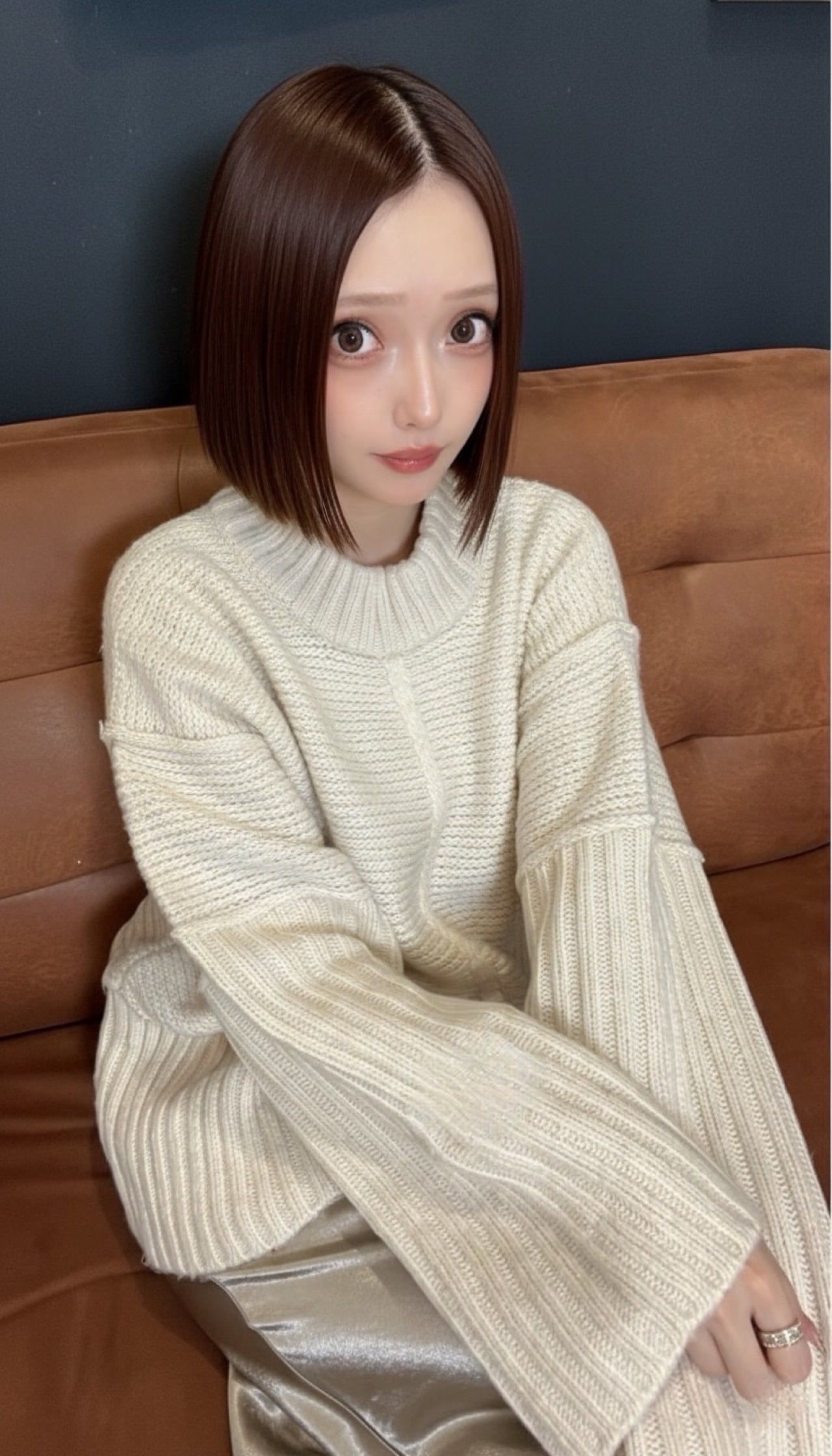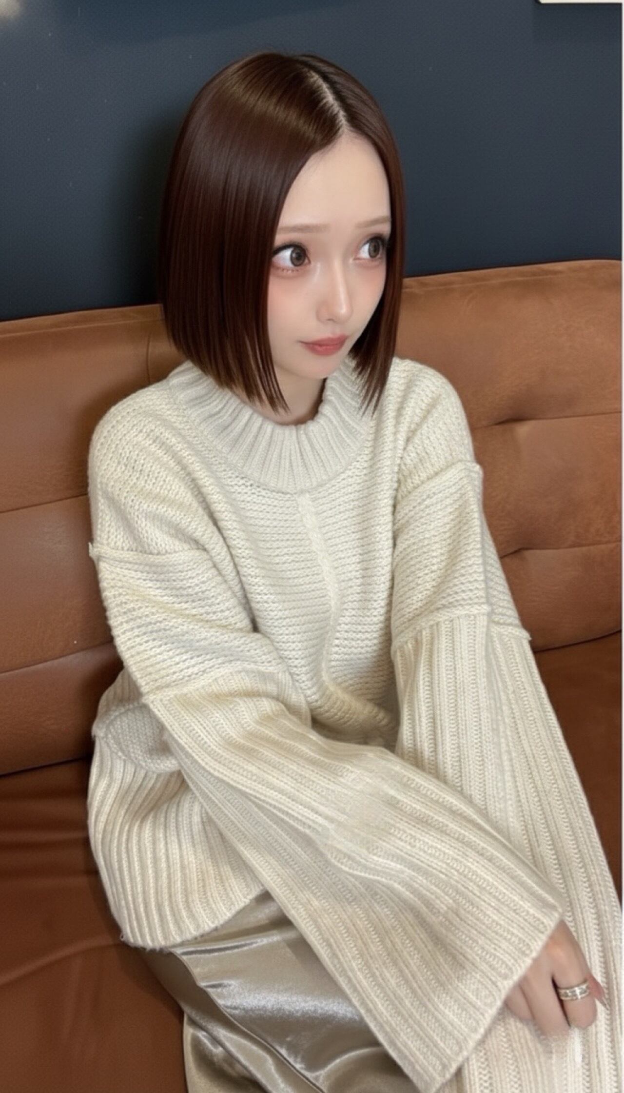 クルーネックリブ切替ニット×サテンスカート(グレージュ)