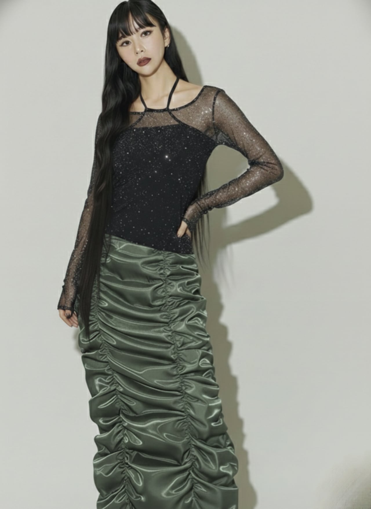 華やかなラメチュールトップスと箔オーガンジーギャザーナロースカートのセットが新登場!特別なシーンから普段使いまで幅広く活躍する、魅力的なコーディネートアイテムです♡