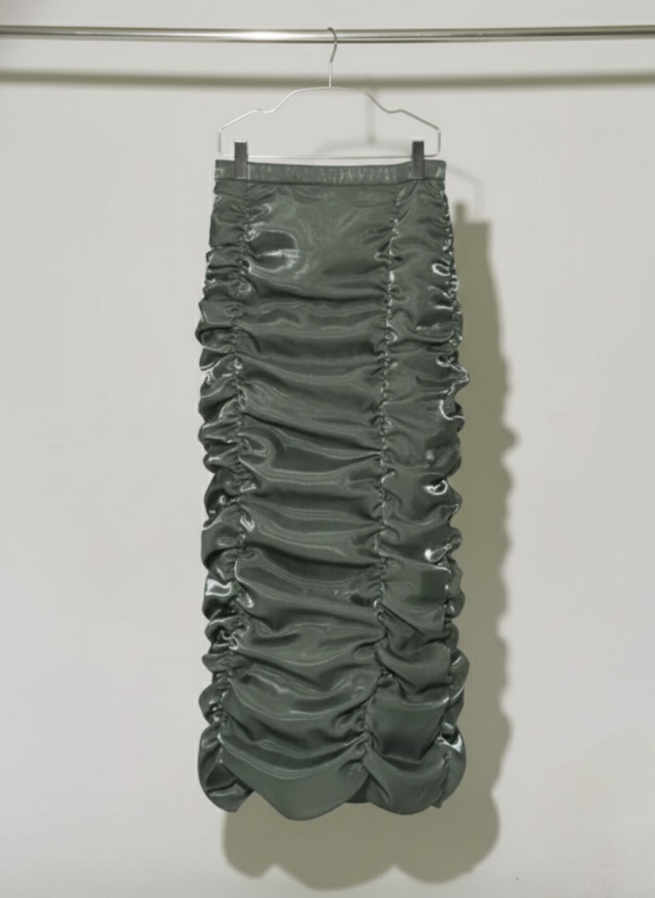 ラメチュールトップス× 箔オーガンジーギャザーナロースカート(カーキ)