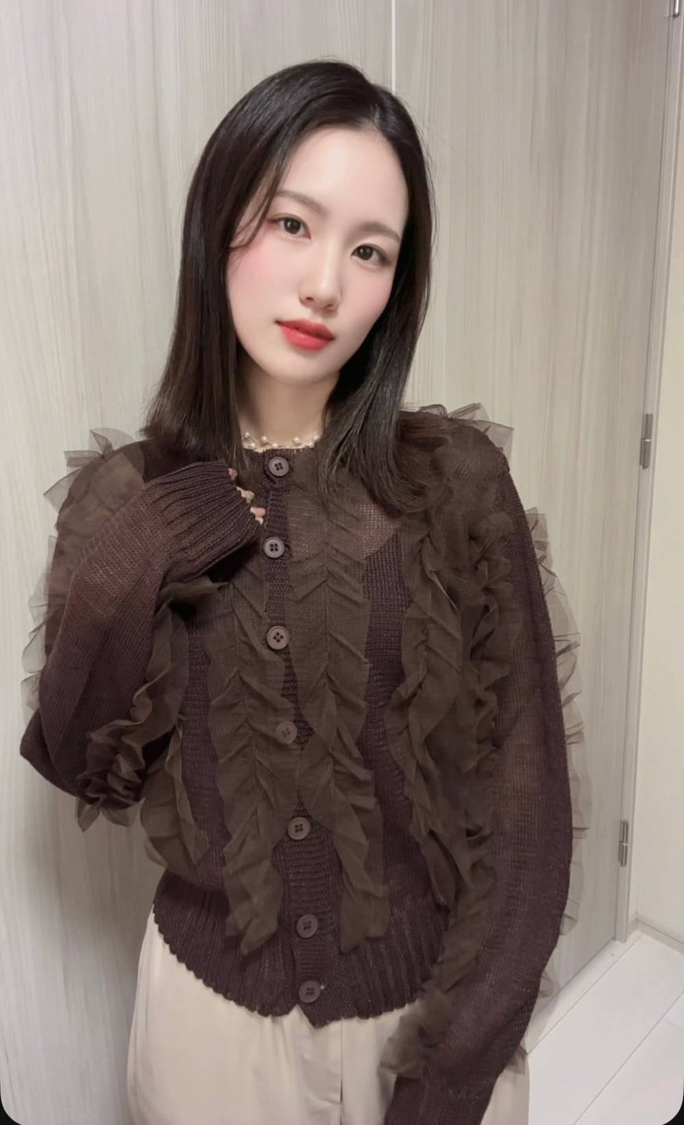 **チュールカーディガントップス(ブラウン)×パールチョーカーネックレス**