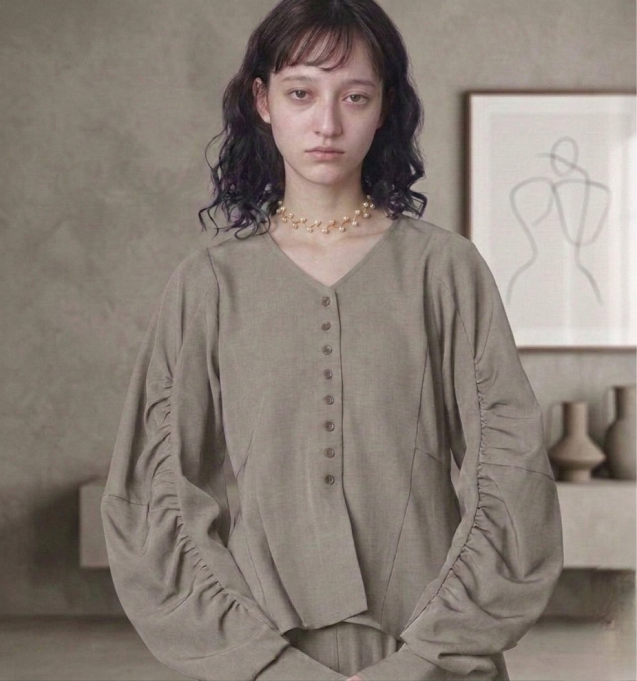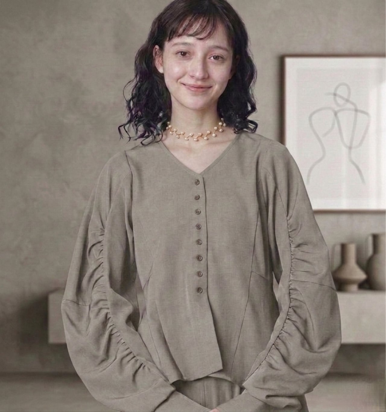 **カーブスリーブぺプラムブラウス(ベージュ)×パールチョーカー**